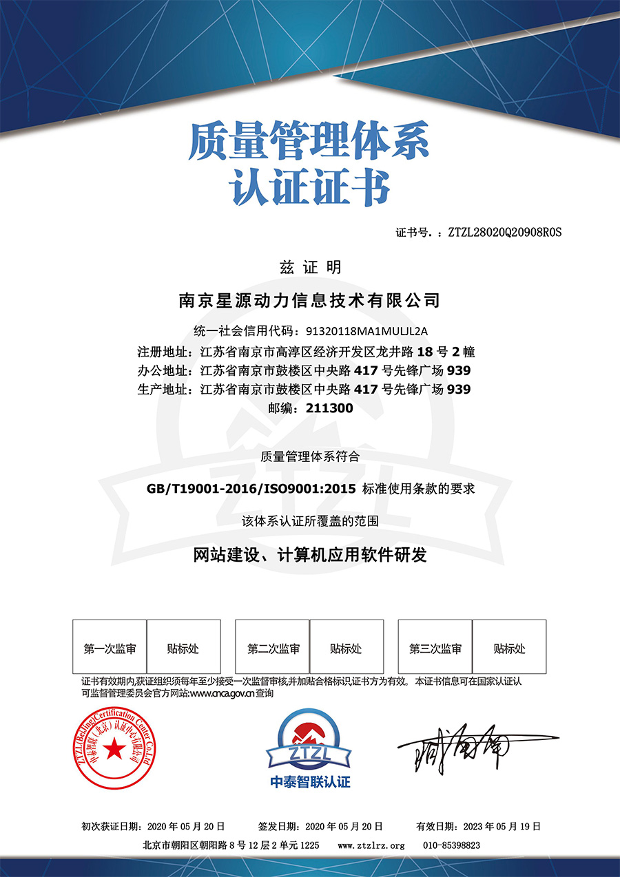 2020年5月,南京星源動(dòng)力信息技術(shù)有限公司正式通過ISO9001:2015質(zhì)量管理體系認(rèn)證審核,并獲得相關(guān)證書。